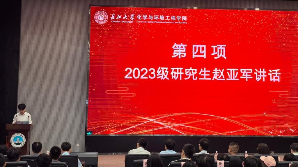 随后,本科新生代表曾可同学发言。她表达了初入大学的欣喜与憧憬,并围绕自立自强、勇于尝试与创新等内容,分享了自己对大学生活的理解与期待。2023级研究生代表赵亚军同学结合自身考研经历与科研实践,为学弟学妹们送上真挚寄语。他强调目标引领与时间管理的重要性,鼓励大家尽早明确发展方向,保持自律与定力,在求知路上坚定前行,收获充实而精彩的大学生活。